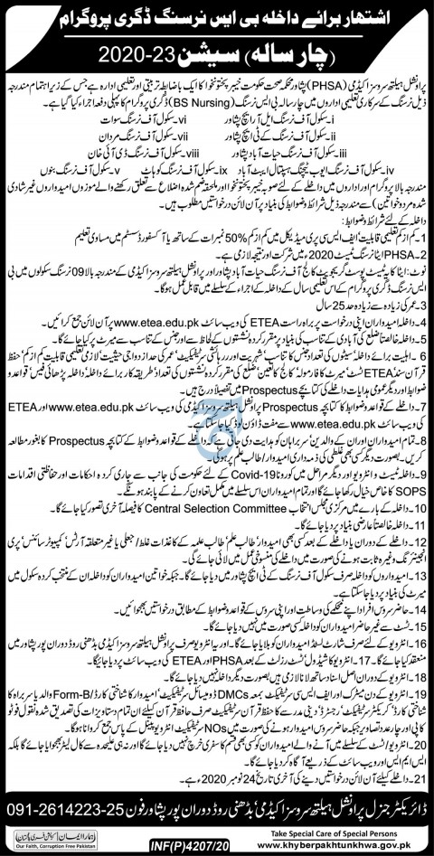 Provincial Health Services Academy PSHA Peshawar, Health Department Government of Khyber Pakhtunkhwa is offering admissions in BS Nursing Degree Programs via Educational Testing and Evaluation Agency ETEA. Read newspaper ad for exact details.