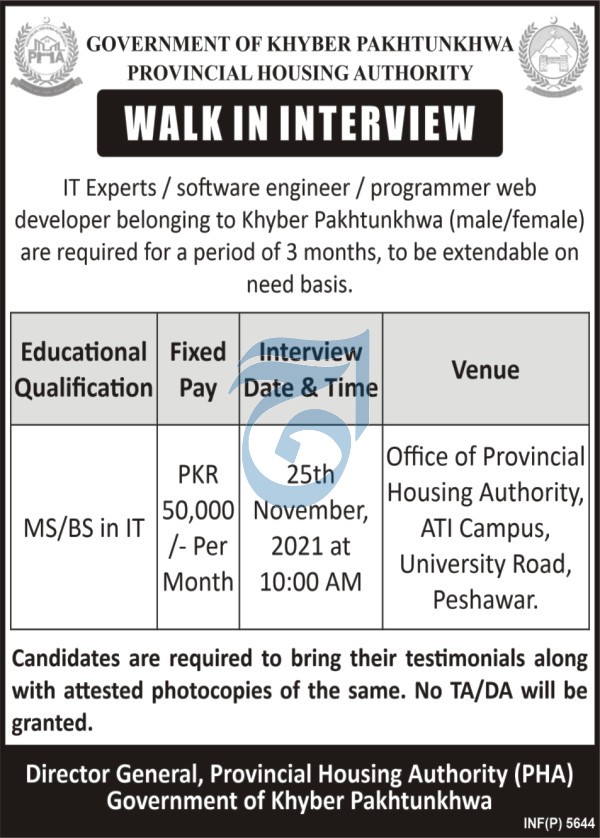 Latest Provincial Housing Authority IT Posts Peshawar 2025