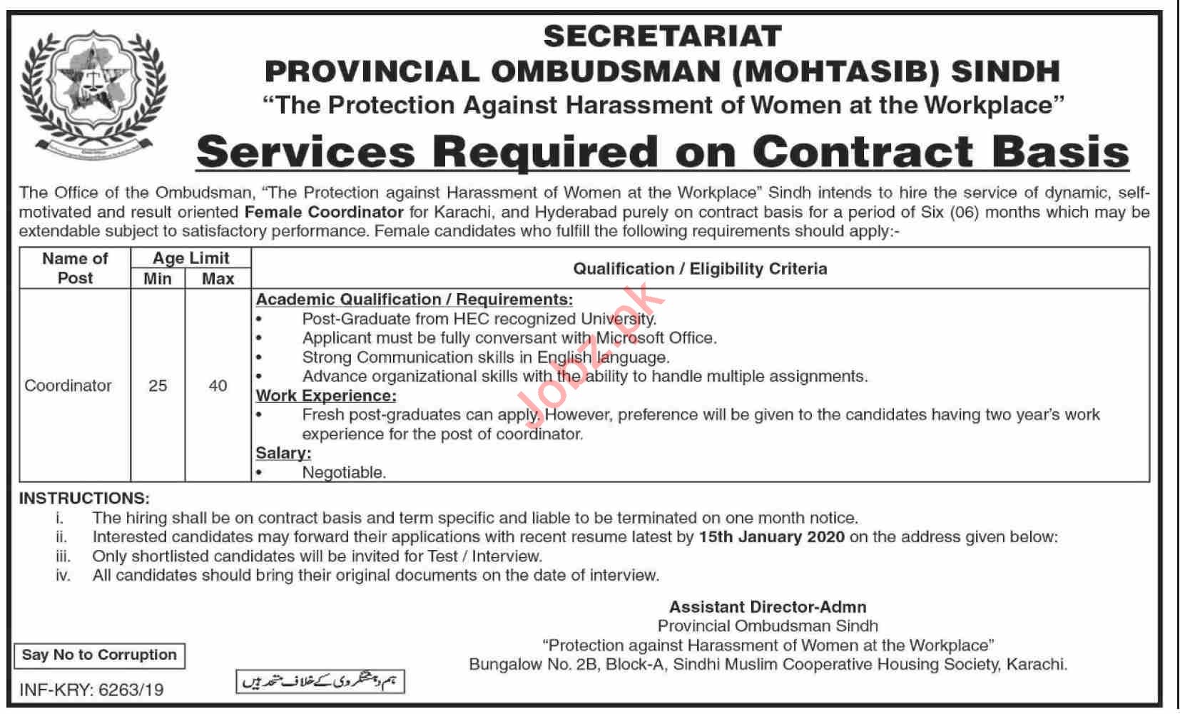 Provincial Ombudsman Mohatasib Sindh Coordinator Jobs 2020