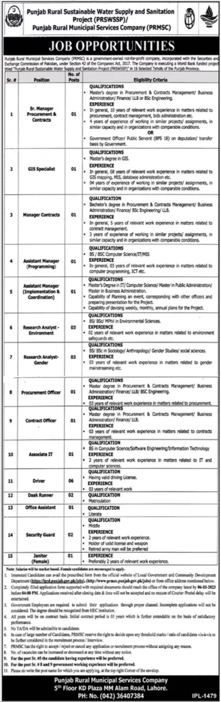 Vacant posts including office assistant, driver, research analyst gender, procurement officer, janitor, gis specialist, assistnat manager implementation coordination, manager procurement, security guard, contract officer, manager contracts, associate it, dak runner, assistant manager programming and research analyst environment are announced in Punjab Rural Municipal Services Company Lahore, lahore Punjab Pakistan as per 18 February 2023 advertisement in daily Dunya Newspaper. Candidates with Bachelor, LLb, Middle, Master, Primary and Matric etc. educational background will be preferred.