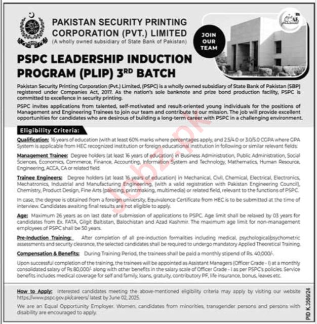 Latest Management jobs and others Government jobs in Pakistan Security Printing Corporation Pvt Ltd closing date is around June 2, 2025, see exact from ad. Read complete ad online to know how to apply on latest Pakistan Security Printing Corporation Pvt Ltd job opportunities.