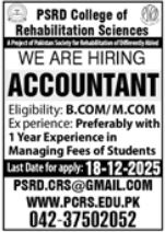 PSRD College of Rehabilitation Sciences jobs advertisement dated about 14 December 2025 in daily Jang Newspaper invites application for the vacant post of accountant in Lahore, lahore Punjab Pakistan. Master, Bachelor and MS etc. educational qualification will be preferred.