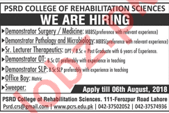 Latest PSRD College of Rehabilitation Sciences Medical Posts Lahore 2025
