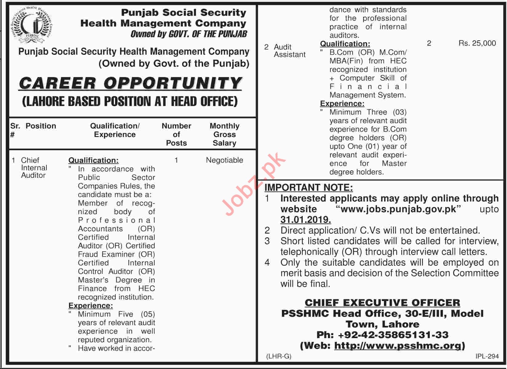 PSSHMC Lahore Jobs 2019 for Internal Auditor & Asst Auditor