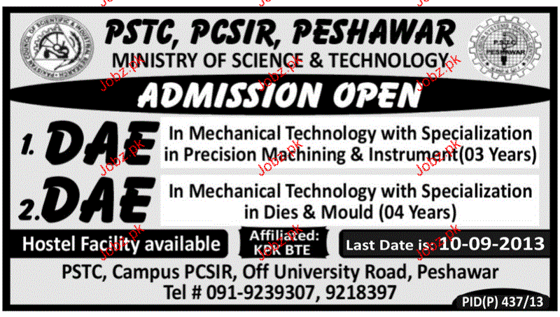 PSTCm PCSIR Peshawar Admission in DAE in Mechanical in Peshawar Read newspaper ad for exact details.