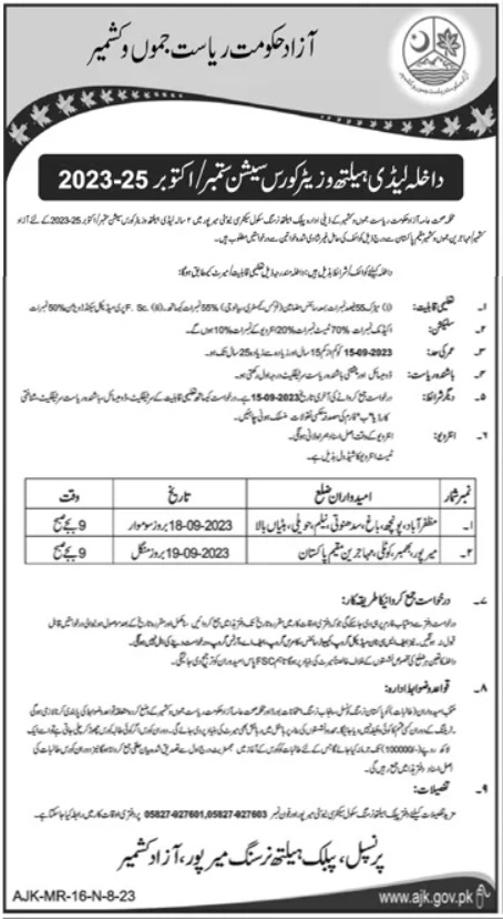 Admissions in Public Health Department 2023 for Diploma in Lady Health Visitor, LHV Diploma has been announced. Students who want to take admissions in Public Health Department Muzaffarabad AJK Pakistan for academic year 2023 to continue education in Medical Medical College can apply. Eligible candidates for admissions in Diploma can apply as per Government institute criteria and before closing date 15 September 2023 after reading advertisement online. Read newspaper ad for exact details.