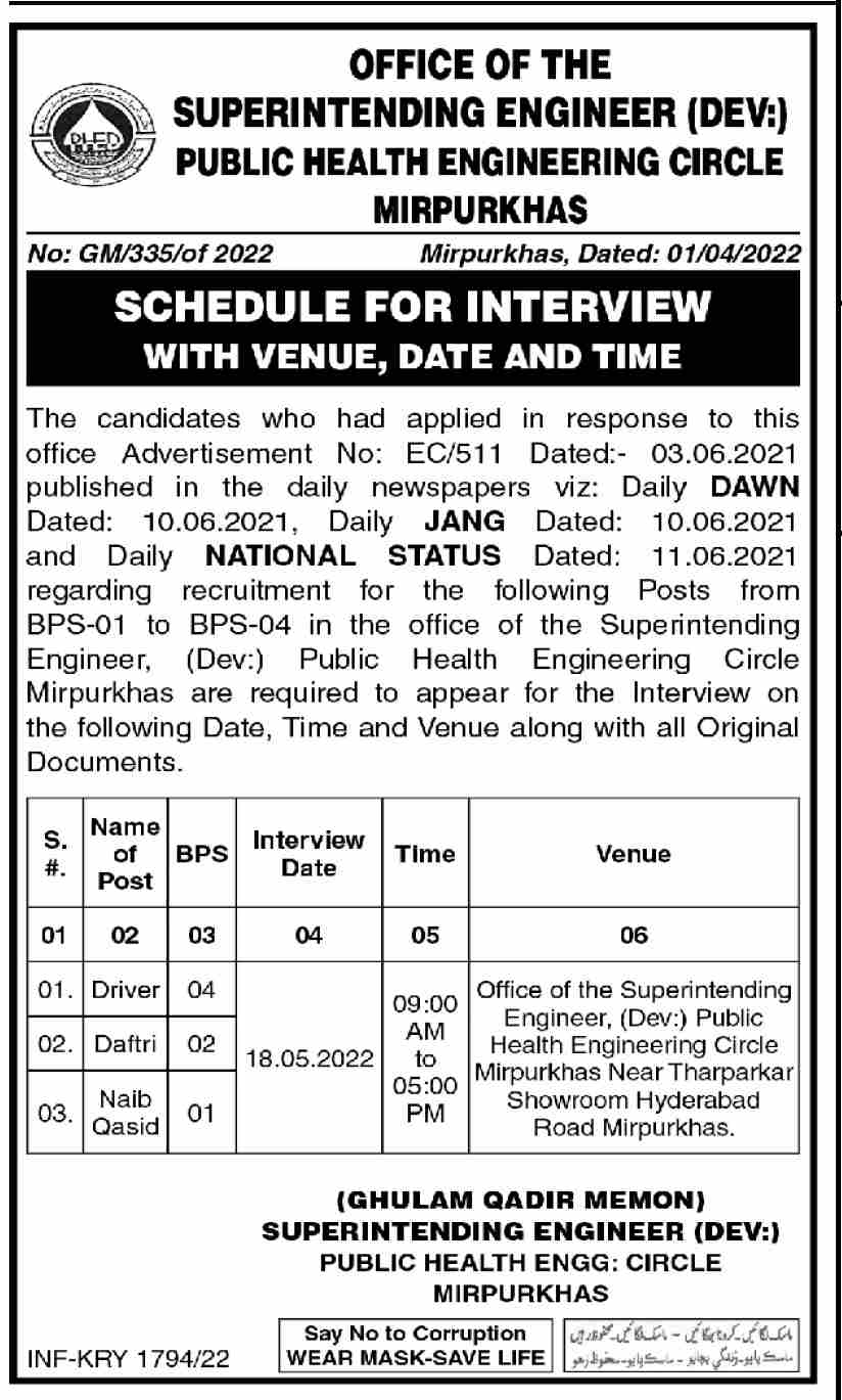 Public Health Engineering Division is looking for candidates for following posts as per job advertisement published in daily Dawn Newspaper of April 11, 2022 for location Mirpur Khas, mirpur khas Sindh Pakistan: