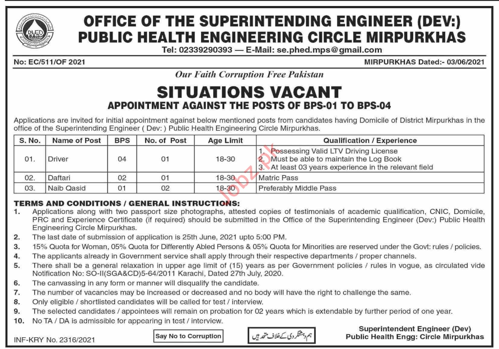 Public Health Engineering Circle PHED Mirpur Khas Jobs 2021