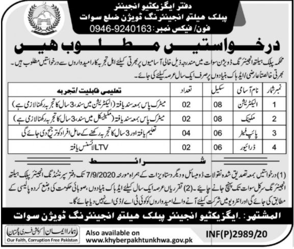 Vacancies in Public Health Engineering Department Advertisement August 2020