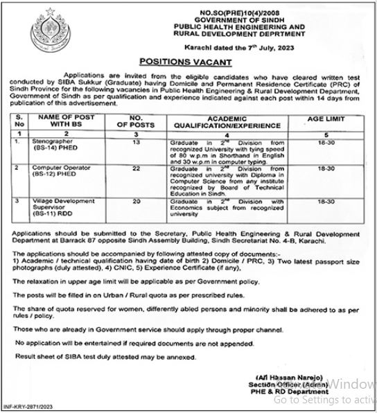 Public Health Engineering & Rural Development Department PHE & RD is looking for candidates for following posts as per job advertisement published in daily Jang Newspaper of July 9, 2023 for location Karachi, karachi Sindh Pakistan: