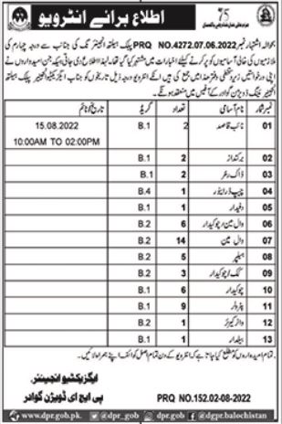 Public Health Engineering Division Gwadar, gwadar Balochistan Pakistan invites applications from eligible candidates for the post of chowkidar, baildar, cook, naib qasid, jeep driver and dack reader as per advertisement of August 3, 2022 published in daily Jang Newspaper. Persons with Matric, Middle and Intermediate etc. education can apply.
