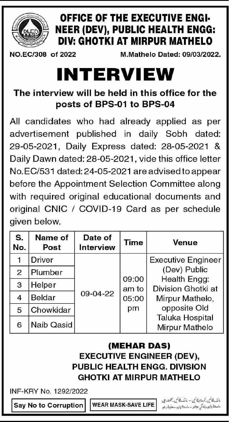 Public Health Engineering Division jobs advertisement dated about 13 March 2022 in daily Dawn Newspaper invites application for the vacant post of naib qasid, driver, beldar, helper, plumber and chowkidar in Ghotki, ghotki Sindh Pakistan. Primary and Middle etc. educational qualification will be preferred.