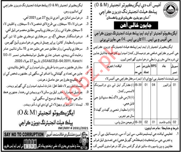 Public Health Engineering Division O&M Karachi Jobs 2021