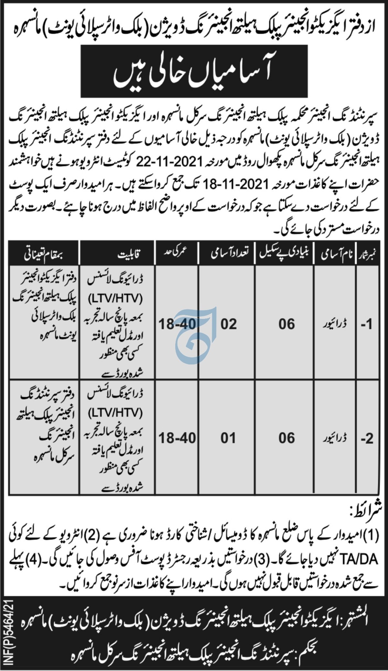 Latest Public Health Engineering Department Driving Posts Mansehra 2025