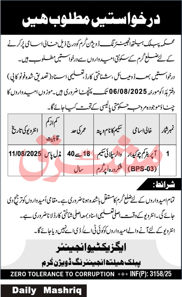 Public Health Engineering Division is looking for candidates for following posts as per job advertisement published in daily Mashriq Newspaper of July 24, 2025 for location Kurram, kurram Khyber Pakhtunkhwa KPK Pakistan:
