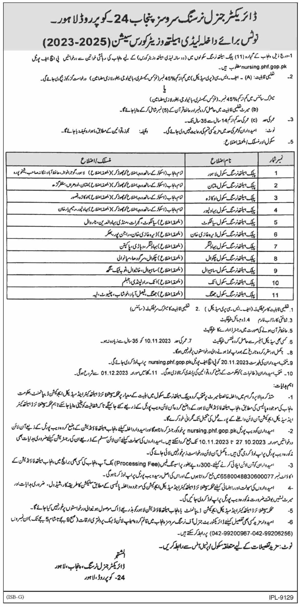 Public Health Nursing School admissions 2023 for Lady Health Visitor LHV has been announced. Students who want to take admissions in Public Health Nursing School Lahore Punjab Pakistan for academic year 2023 to continue education in Medical College can apply. Eligible candidates for admissions in Course and Diploma can apply as per Government institute criteria and before closing date 10 November 2023 after reading advertisement online. Read newspaper ad for exact details.