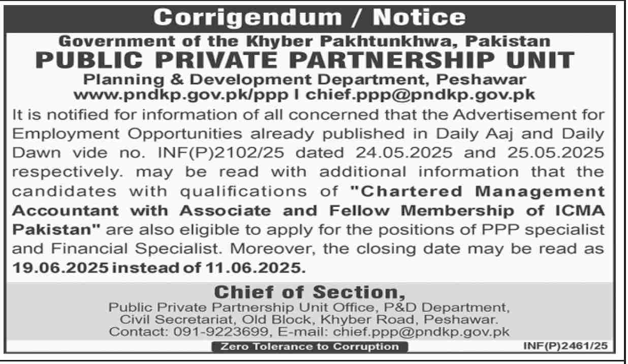 Planning and Development Department Cantt Peshawar, peshawar Khyber Pakhtunkhwa KPK Pakistan invites applications from eligible candidates for the post of chartered management accountant as per advertisement of June 7, 2025 published in daily Dawn Newspaper. Candidates with Others, CA and Master etc. educational background will be preferred.