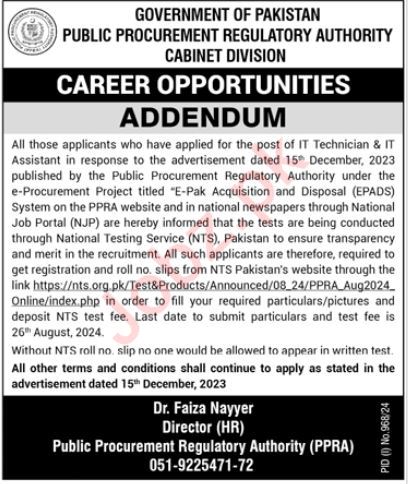 Vacant posts including it technician and it assistant are announced in Public Procurement Regulatory Authority PPRA Islamabad, islamabad Islamabad Pakistan as per 11 August 2024 advertisement in daily Jang Newspaper. Preferred Education is Bachelor, MS and Master etc.