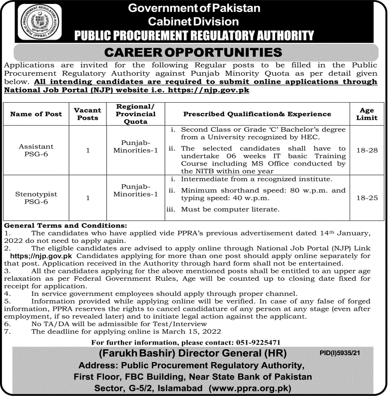 Public Procurement Regulatory Authority PPRA Islamabad, islamabad Islamabad Pakistan invites applications from eligible candidates for the post of stenotypist and assistant as per advertisement of February 26, 2022 published in daily Ausaf Newspaper. Preferred Education is Bachelor etc.