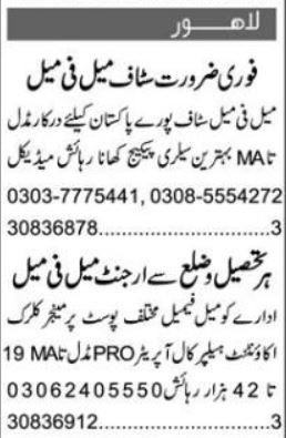 Private Company jobs advertisement dated about 7 December 2022 in daily Express Newspaper invites application for the vacant post of office staff, manager, call operator, accountant, clerk, public relation officer, helper and pro in Lahore, lahore Punjab Pakistan. Middle, Intermediate, Matric and Bachelor etc. educational qualification will be preferred.