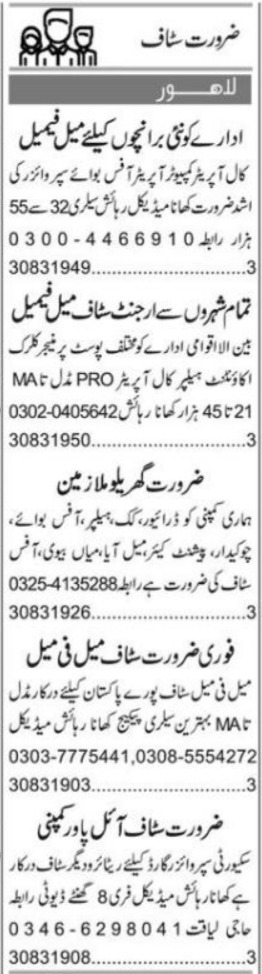Private Company Lahore, lahore Punjab Pakistan invites applications from eligible candidates for the post of manager, public relation officer, driver, office staff, clerk, husband wife, aya, computer operator, security guard, patient care, pro, office boy, ltv driver, call operator, helper, accountant, supervisor and security supervisor as per advertisement of October 25, 2022 published in daily Express Newspaper. Educational qualifications required Middle, Matric, Bachelor and Intermediate etc.