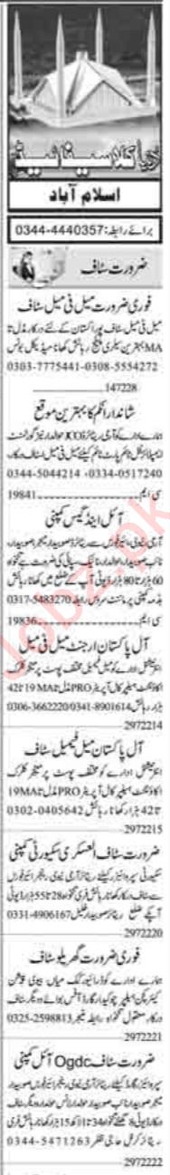 Private Company Islamabad, islamabad Islamabad Pakistan invites applications from eligible candidates for the post of manager, havaldar, helper, office staff, husband wife, jco, public relation officer, driver, accountant, patient care, ltv driver, clerk, chowkidar, call operator, cook, office boy, security guard, naib subedar, guard, chef, kitchen helper, subedar, sepoy and security supervisor as per advertisement of July 29, 2022 published in daily Dunya Newspaper. Bachelor, Matric, Middle and Intermediate etc. educational qualification will be preferred.