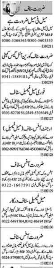 Sales Officer, Secretary, Personal Secretary, Peon, Lady Accountant, Graphic Designer, Public Relation Officer, PRO, Assistant, Call Representative, Lady Office Assistant, Front Desk Officer, Cashier, Customer Service Representative seeks in well established companies.