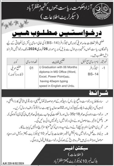 Vacant posts including stenographer are announced in Public Relations Department Haveli, haveli AJK Pakistan as per 7 February 2024 advertisement in daily Jang Newspaper. Educational qualifications required Bachelor etc.