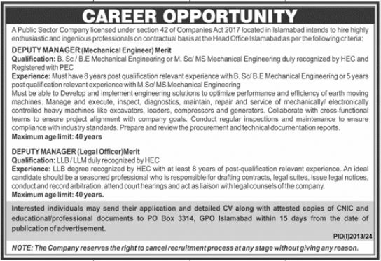 Public Sector Company invites applications for job positions advertised in daily Jang dated 19 September 2024 for following vacancies in Islamabad, islamabad Islamabad Pakistan.