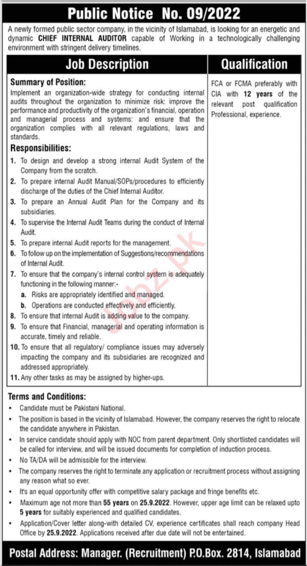 Public Sector Company invites applications for job positions advertised in daily Jang dated 18 September 2022 for following vacancies in Islamabad, islamabad Islamabad Pakistan.