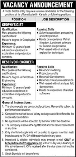 Public Sector Company invites applications for job positions advertised in daily Jang dated 27 October 2024 for following vacancies in Karachi, karachi Sindh Pakistan.