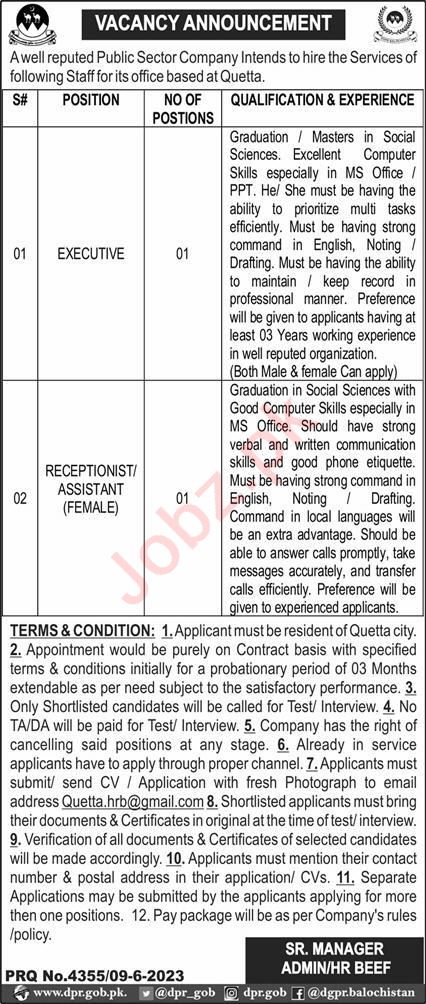 Public Sector Company Quetta, quetta Balochistan Pakistan invites applications from eligible candidates for the post of receptionist, assistant and executive as per advertisement of June 11, 2023 published in daily Express Newspaper. Master, Bachelor and MS etc. educational qualification will be preferred.