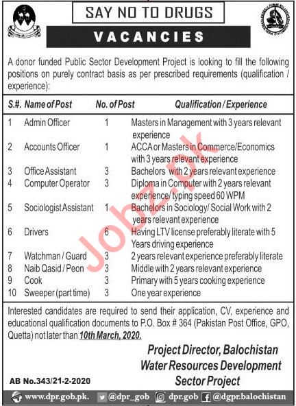 A donor funded Public Sector Development Project is looking for qualified and experienced individuals for the positions of Admin Officer, Accounts Officer, Office Assistant, Computer Operator, Sociologist, Assistant, LTV Driver, Watchman, Security Guard, Naib Qasid, Peon, Cook and Sweeper in Quetta Balochistan 2020.