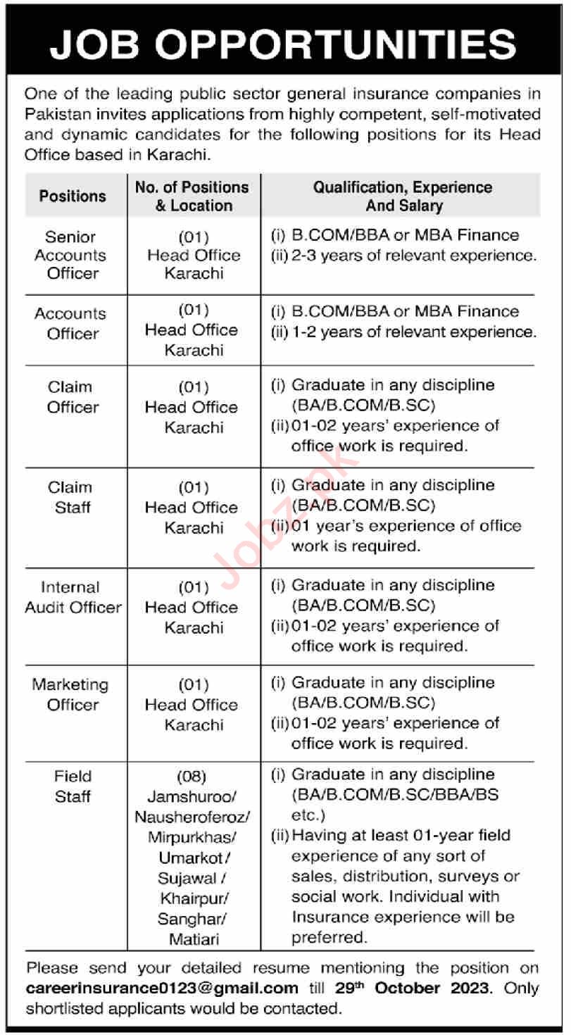 General Insurance Company jobs advertisement dated about 15 October 2023 in daily Dawn Newspaper invites application for the vacant post of accounts officer, field staff, claim officer, claim staff, internal audit officer and marketing officer in Karachi, karachi Sindh Pakistan. B.com, BBA and Bachelor etc. educational qualification will be preferred.