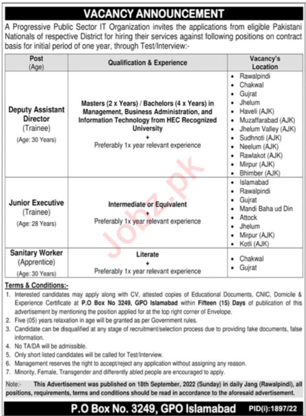 Vacant posts including deputy assistant director, sanitary worker and executive are announced in Public Sector IT Organization Islamabad, islamabad Islamabad Pakistan as per 25 September 2022 advertisement in daily Jang Newspaper. Educational qualifications required Master, Primary, Bachelor and Intermediate etc.