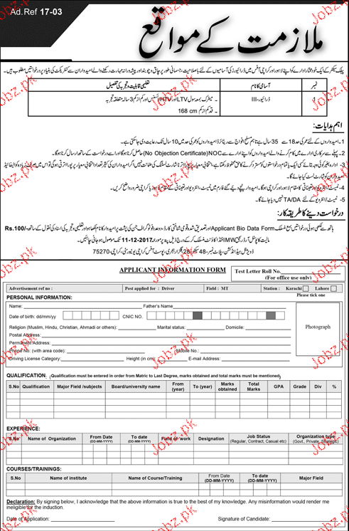 Apply as per details in job advertisement. Login to view further details of how to apply via https://www.jobz.pk online.