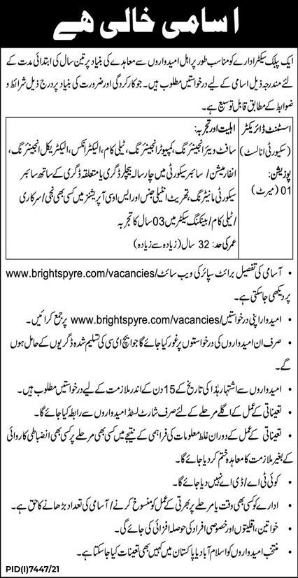 Vacant posts including assistant director, security analyst and assistant director security nanlyst are announced in Public Sector Organization Islamabad, islamabad Islamabad Pakistan as per 24 April 2022 advertisement in daily Express Newspaper. Educational qualifications required Master, B.E and Bachelor etc.