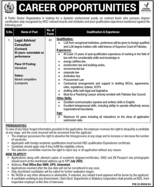 Public Sector Organization jobs advertisement dated about 25 June 2025 in daily The News Newspaper invites application for the vacant post of consultant and legal advisor in Islamabad, islamabad Islamabad Pakistan. Persons with LLb, Master and Bachelor etc. education can apply.