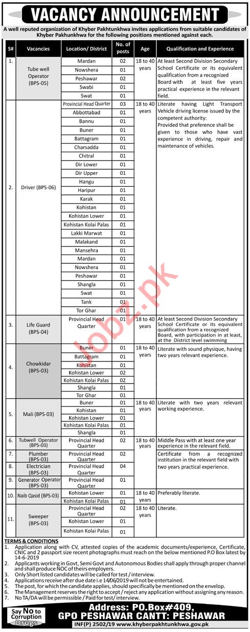 A well reputed Public Sector Organization invites applications from experienced and strong personnel for the posts of Tube Well Operator, Driver, Life Guard, Chowkidar, Mali, Tube Well Operator, Plumber, Electrician, Generator Operator, Naib Qasid & Sweeper in Mardan, Nowshera, Peshawar, Swabi, Swat, Abbottabad, Bannu, Buner, Battagram, Charsadda, Chitral, Dir Lower, Dir Upper, Hangu, Haripur, Karak, Kohistan, Lakki Marwat, Malakand, Manshera, Mardan, Nowshera, Peshawar, Shangla, Swat, Tank, Torghar, Buner, Battagram.