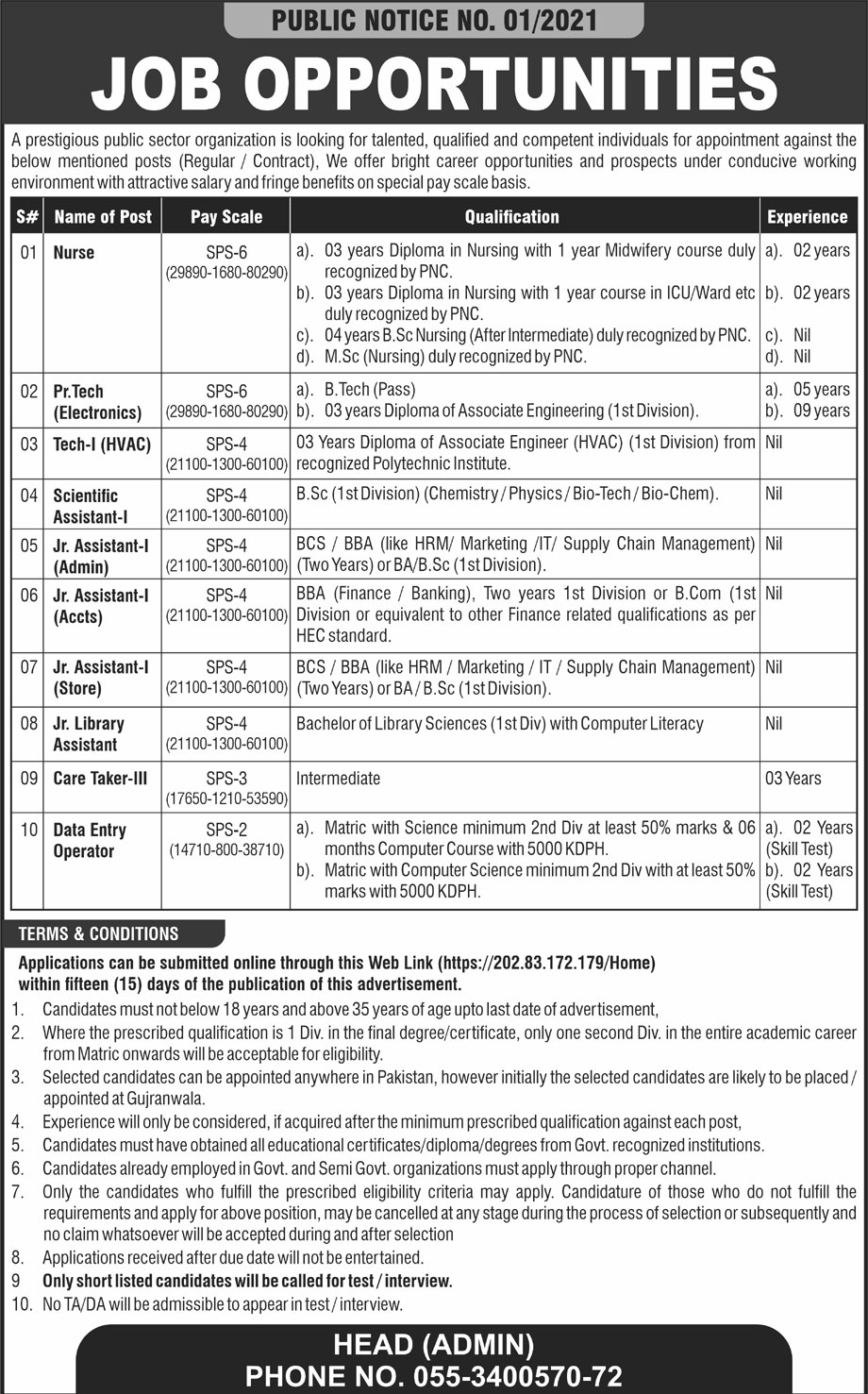 A well known public sector organization is looking for qualified and technical candidates for the posts of Nurse, Pr Tech Electronics, Tech-I HVAC, Scientific Assistant-I, Junior Assistant-I Admin, Junior Assistant-I Accounts, Junior Assistant-I Store, Junior Library Assistant, Care Taker-III, Data Entry Operator, DEO in Gujranwala, Punjab.
