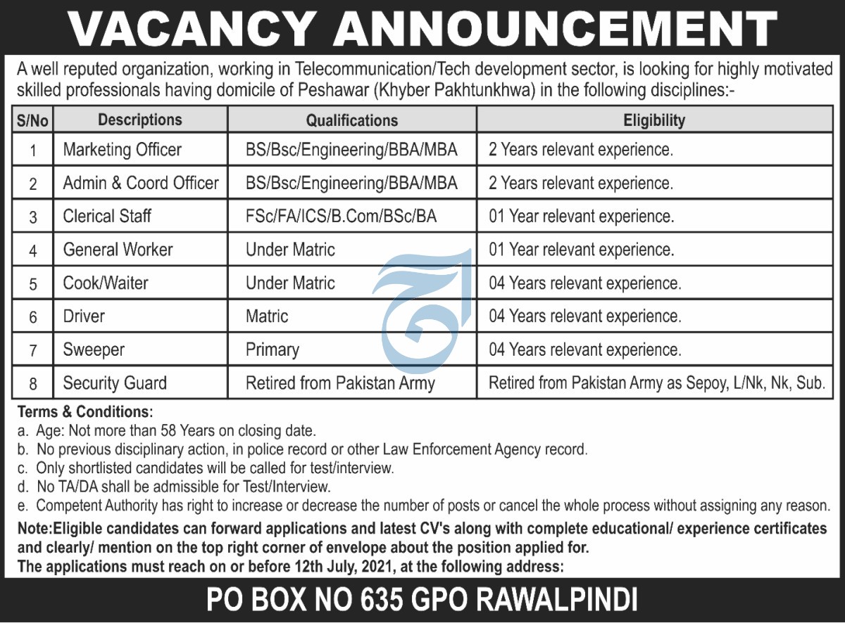 A well reputed Public Sector Organization invites applications from qualified and experienced candidates for the posts of Marketing Officer, Admin Officer, Coordination Officer, Clerk, General Worker, Cook, Waiter, LTV Driver, Sweeper and Security Guard in Rawalpindi.