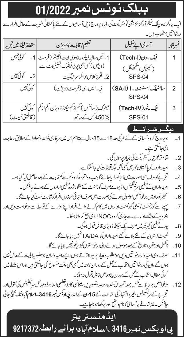 Public Sector Organization jobs advertisement dated about 5 June 2022 in daily Express Newspaper invites application for the vacant post of tech i, scientific assistant and tech iv in Islamabad, islamabad Islamabad Pakistan. Educational qualifications required Bachelor, DAE and Matric etc.