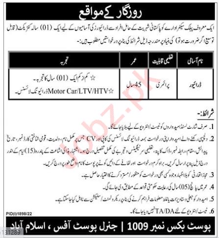 Latest Public Sector Organization Driving Posts Islamabad 2025