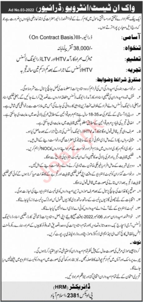 Public Sector Organization jobs advertisement dated about 27 November 2022 in daily Jang Newspaper invites application for the vacant post of driver in Islamabad, islamabad Islamabad Pakistan. Educational qualifications required Matric etc.