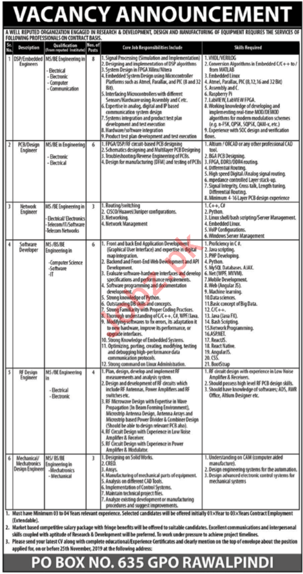 A well reputed Public Sector Organization requires the services of experienced and technical personnel for the posts of DSP Engineer, Electrical Engineer, Electronic Engineer, Computer Engineer, Communication Engineer, Electronic Design Engineer, Electrical Design Engineer, Network Engineer, Software Developer, RF Design Engineer, Mechanical Design Engineer and Mechatronics Design Engineer in Rawalpindi.