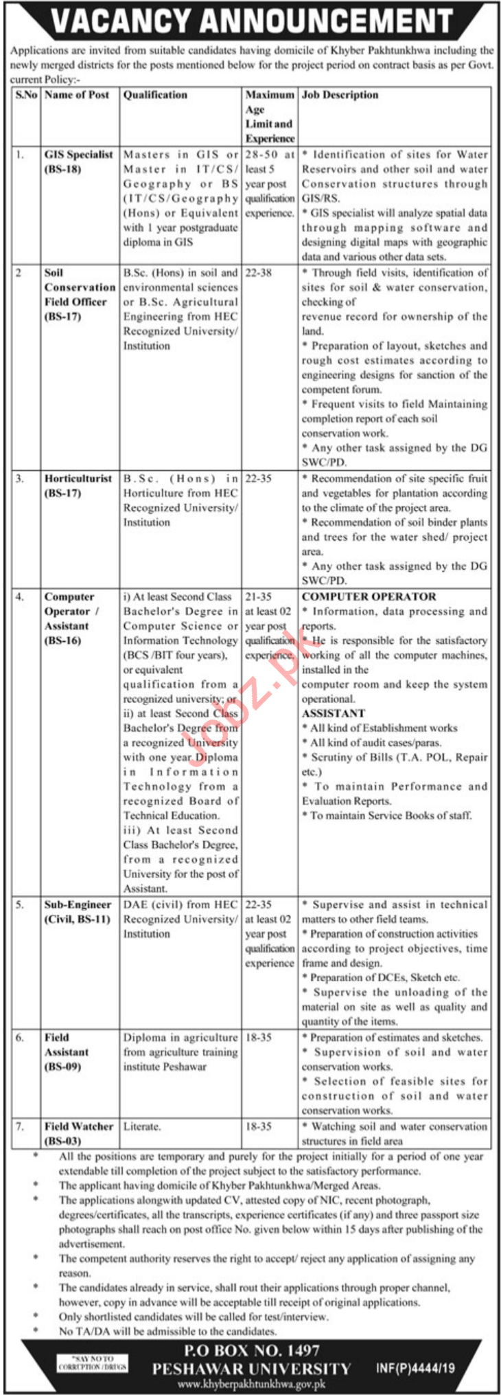 A leading and progressive Public Sector Organization invites applications from highly qualified and well educated candidates for the positions of GIS Specialist, Soil Conservation Field Officer, Horticulturist, Computer Operator, Assistant, Sub Engineer Civil, Field Assistant and Field Worker in Peshawar KPK 2019.