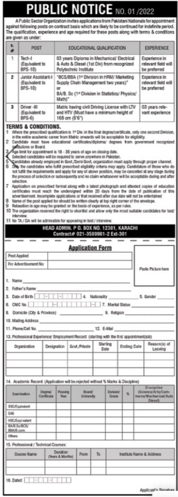 Public Sector Organization jobs advertisement dated about 26 June 2022 in daily Nation Newspaper invites application for the vacant post of tech i, htv driver, assistant i, ltv driver and driver ii in Karachi, karachi Sindh Pakistan. Preferred Education is DAE, BA, BBA, Others, BCS, Bachelor and Matric etc.