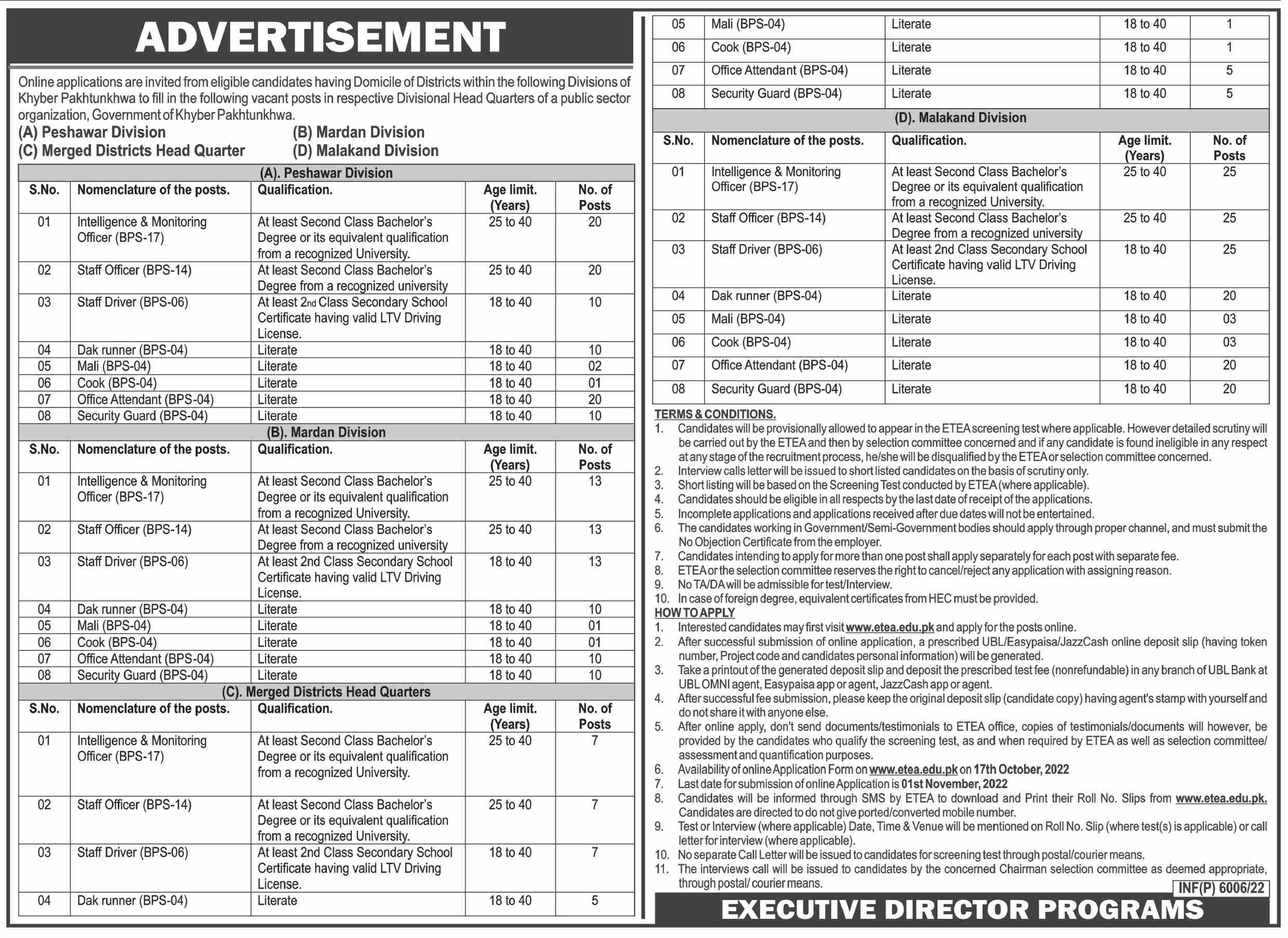 Public Sector Organization latest Government Management jobs and others can be applied till 1 November 2022 or as per closing date in newspaper ad. Read complete ad online via ETEA to know how to apply on latest Public Sector Organization job opportunities.
