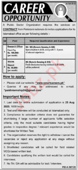 Public Sector Organization invites applications for job positions advertised in daily Jang dated 10 August 2025 for following vacancies in Lahore, lahore Punjab Pakistan.