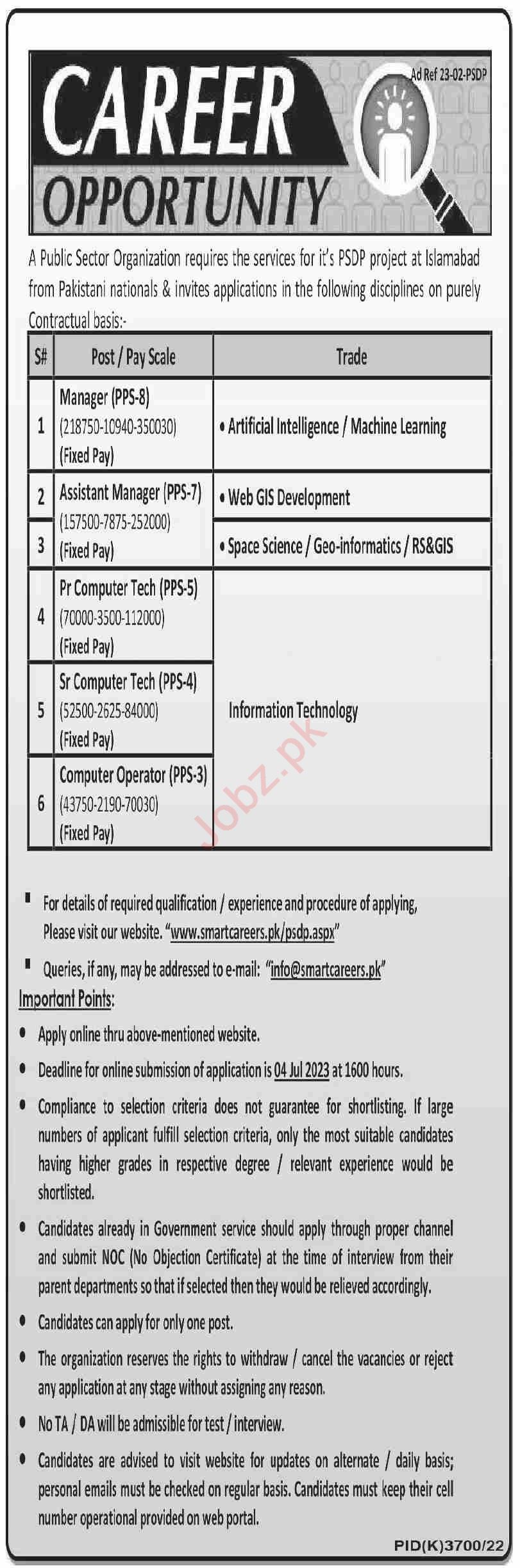 Public Sector Organization Islamabad, islamabad Islamabad Pakistan invites applications from eligible candidates for the post of assistant manager geo informatics, assistant manager web gis development, pr computer tech, manager, manager artificial intelligence, assistant manager space science, manager machine learning, computer operator and assistant manager as per advertisement of June 25, 2023 published in daily Dawn Newspaper. Educational qualifications required Intermediate, Bachelor and Master etc.